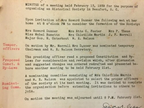 Minutes from the first meeting of the Beaufort County Historical Society in 1939